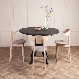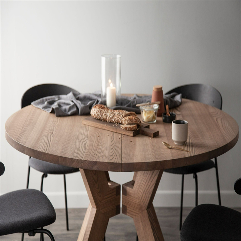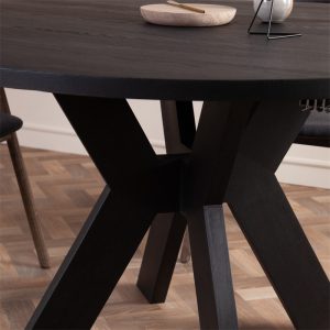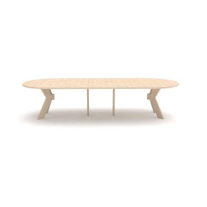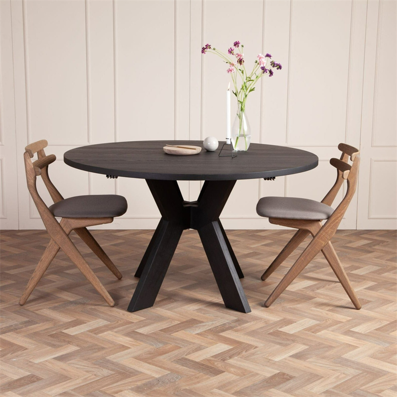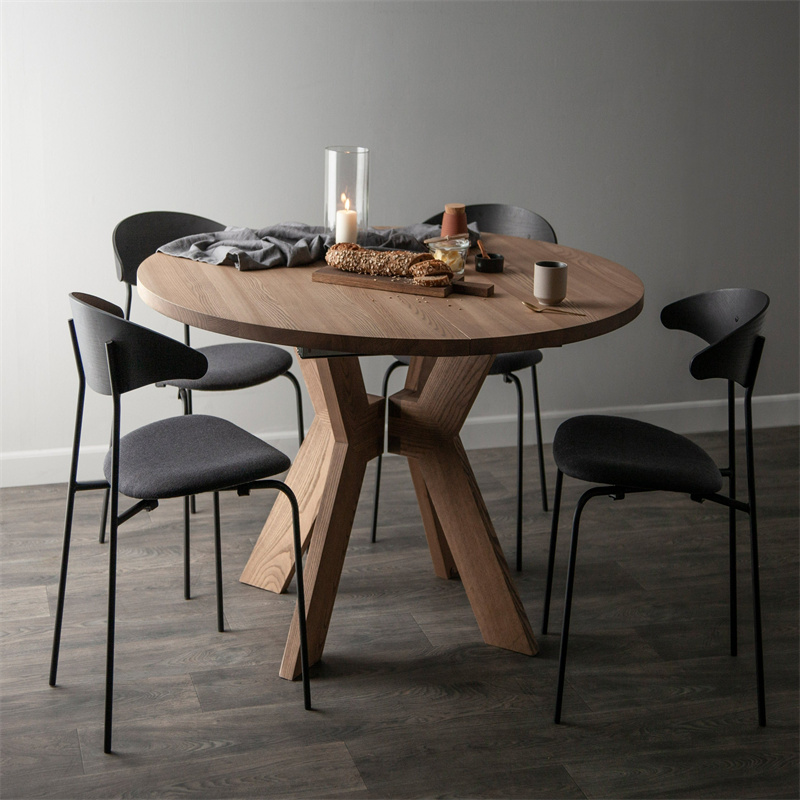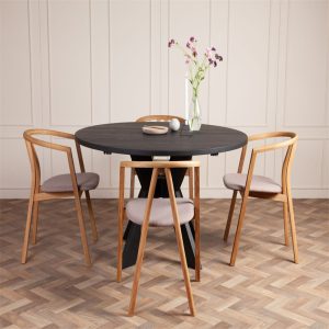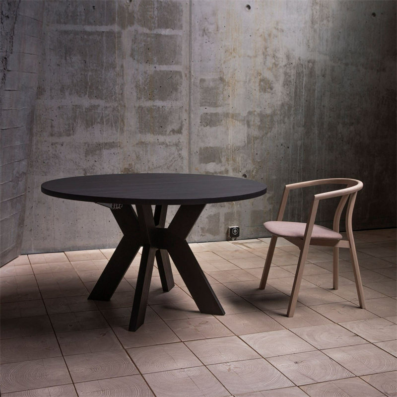 The SNEBEOR table is characterised by the crossing leg where form follows function, as the legs makes room for extra chairs.